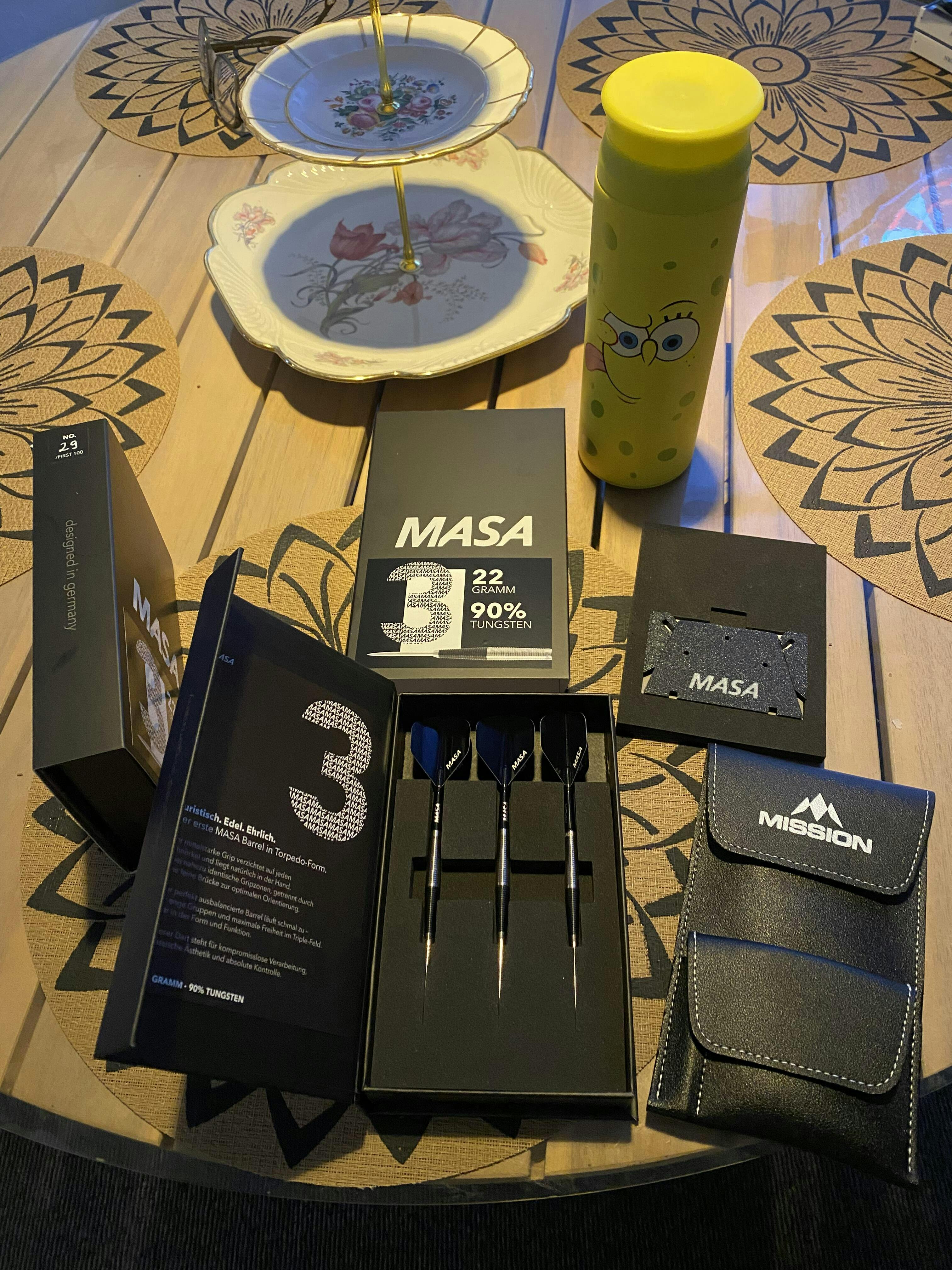 Numbered first edition of 100 sets. The set comes in a premium magnetic box. Included for free: your MASA ClickStand — the perfect place for your new darts.